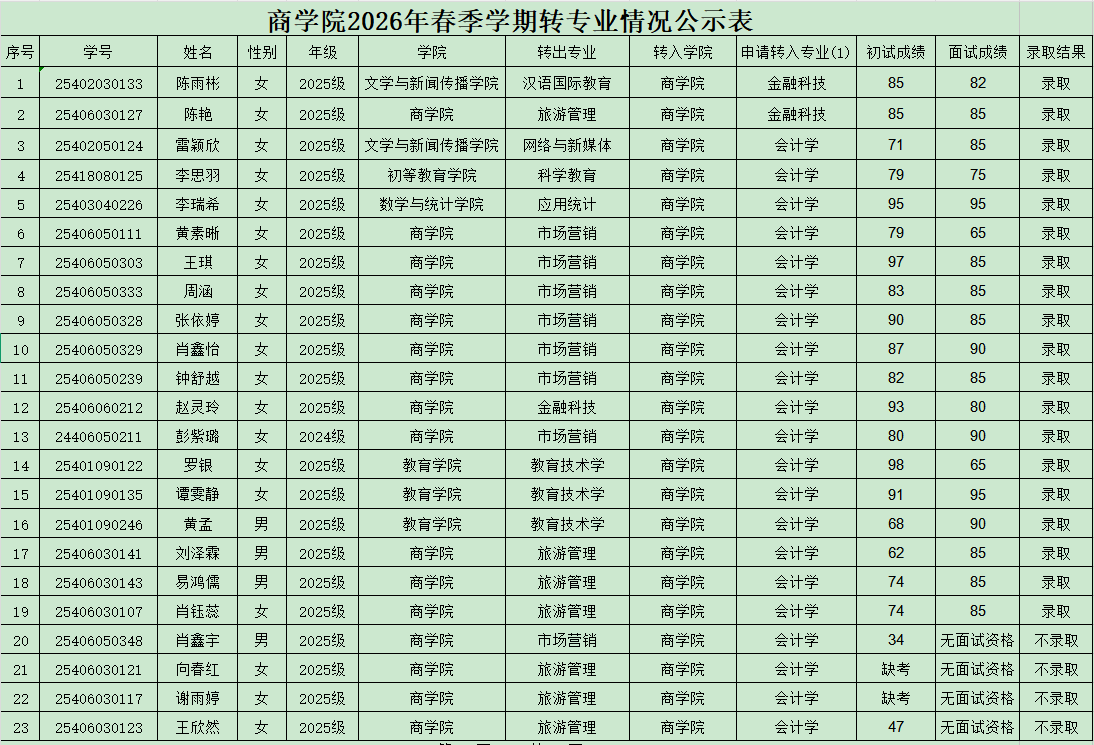 根据《湖南第一师范学院普通全日制本科学生转专业管理办法》(湘一师校字〔2025〕89号)及相关工作要求,经学生个人申请、转入/转出专业资格审核、学院转专业考核小组统一考核,并提交学院党政联席会议审议通过,现将本学期学生转专业结果予以公示(见下图)。