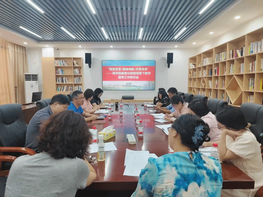 2025年9月16日下午,商学院在玉衡南404召开2025-2026学年第一学期教学工作部署暨督导、系主任会议。会议以"拥抱变革·精准导航·共育未来"为主题,聚焦数智化转型背景下的教学质量提升,由王朝晖院长主持,邓剑书记、荆龙姣副院长、院部督导团成员及各系主任参会。会议通过政策解读、任务部署、专题研讨等环节,系统规划新学期教学督导工作,为实现"十五五"规划教学目标奠定实施路径。